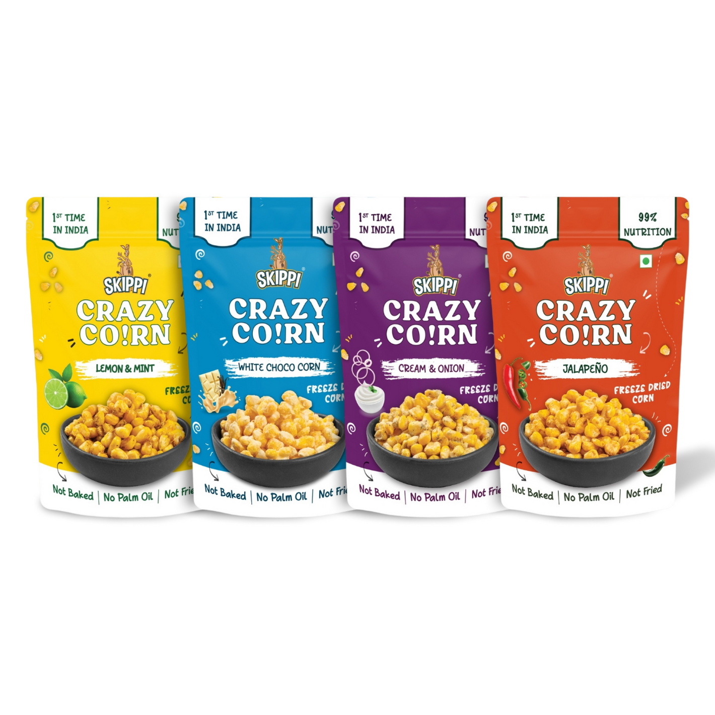 Crispy Crazy Corn Kernels (4 Packs) , Freeze Dried Sweet Corn, Pack of 4 Flavors (Lemon & Mint, White Choco, Jalapeno, Cream & Onion)